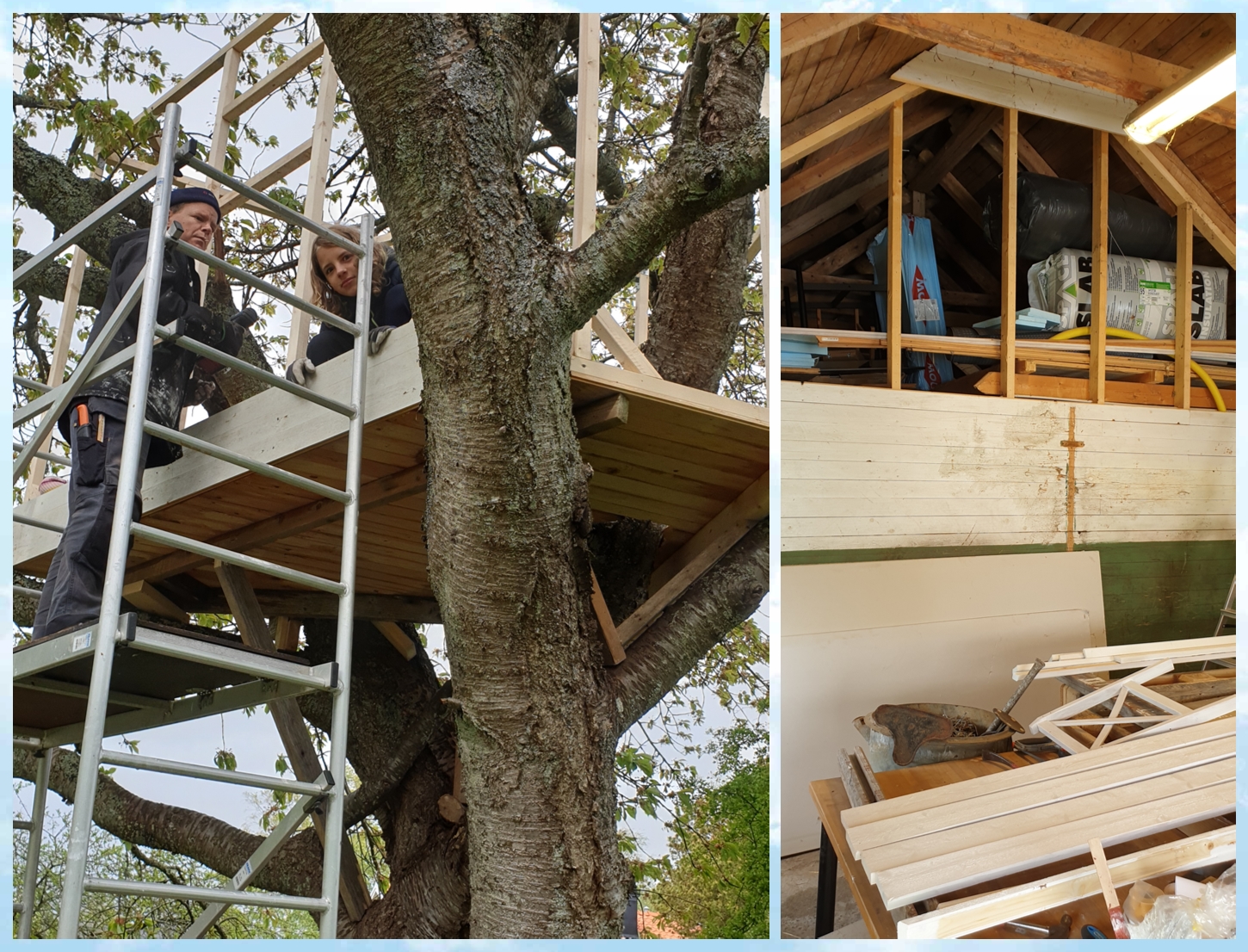 Ska man bygga så högt upp och dessutom till så stora barn så är det förstås viktigt att kojan är ordentligt byggd av bra virke – inga halvruttna restbitar från något annat som varit ute i väder och vind. Så under ledning av byggnadsingenjör O Edlund, vars permittering kommer väl till pass här, har kojbygge 2.0 satt igång.