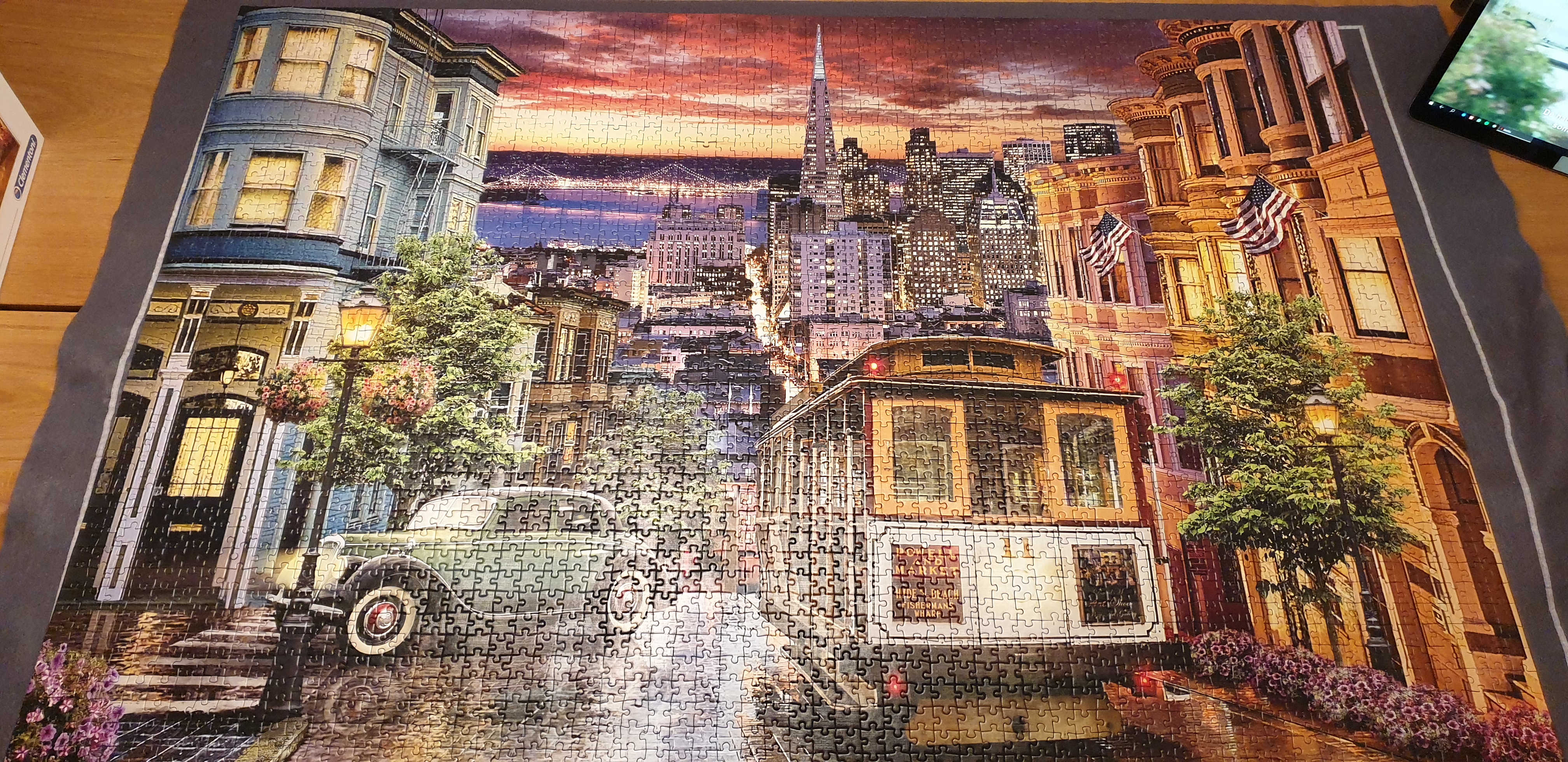 Så, 3000-bitarspusslet med en bild som ska vara från San Fransisco (det tror jag inte det är) är färdiglagt för några veckor sedan. Beklagar blänket men det är inte lätt att ta kort i mörkret med kökslampor som ljus och pusslet har en lite glansig yta.