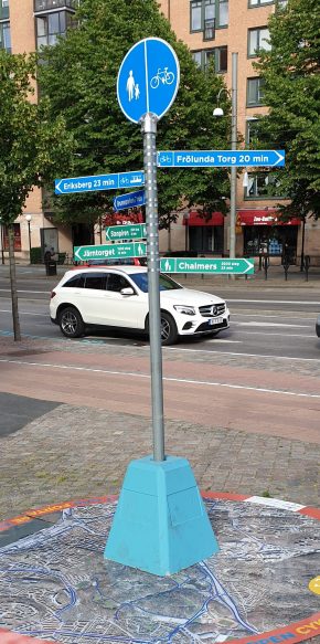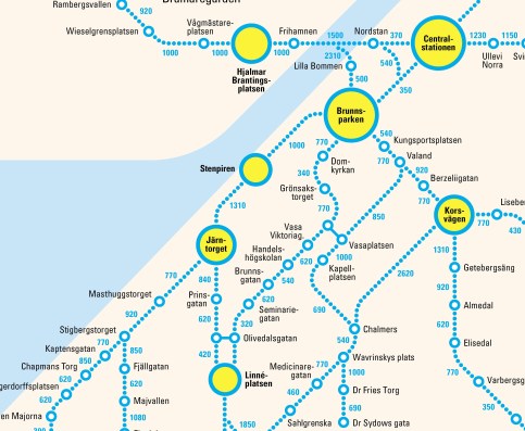 De har också ställt upp skyltar som visar hur långt det är att gå i olika riktningar – antal minuter, inte meter, och dessutom har Västtrafik gjort om spårvagnskartan så den visar sträckningarna som vanligt fast med antal steg istället.