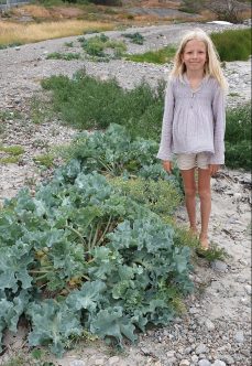 Strandkål är alltså de där stora buskarna med stora grågröna blad som finns i mängder på sandstränderna här nere på Västkusten, och dom kan man alltså äta enligt den här boken.