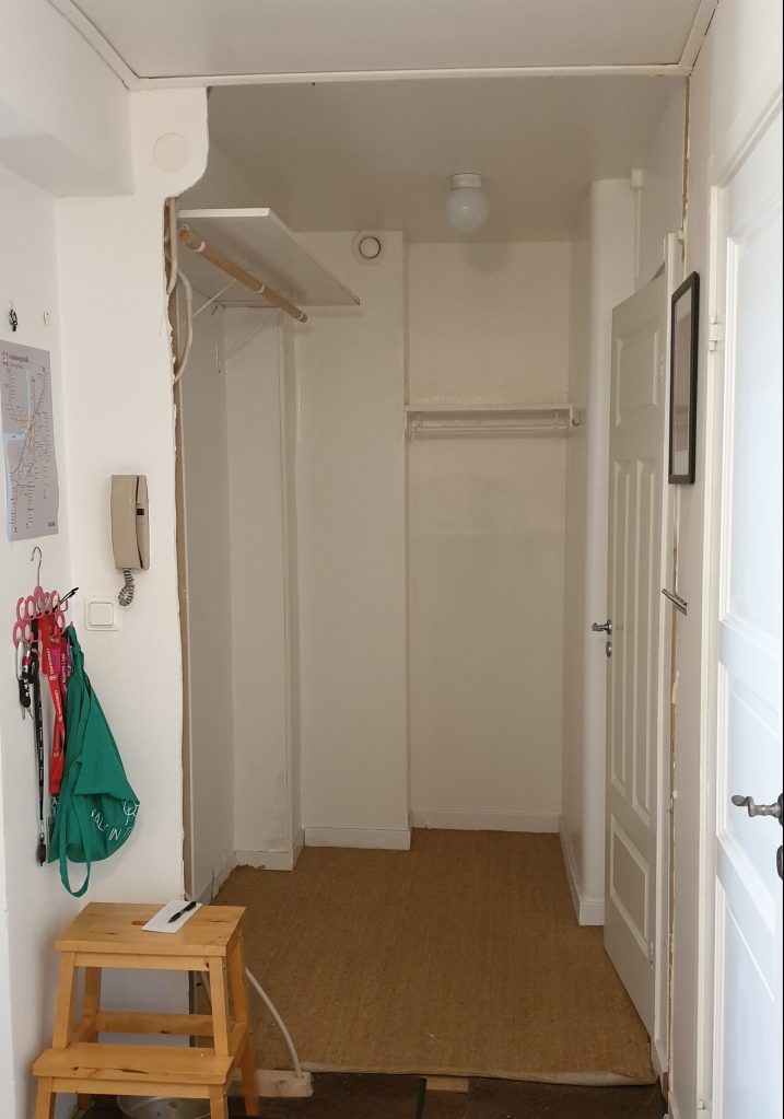 Så bort med alla kläder och fram med tumstock för att mäta ut alla konstiga vinklar och vrår. Det låter ihåligt när man knackar på de två hörnen längst in till vänster, så förhoppningen är att man kan ta bort en del döyta där och få till bättre hängutrymmen och annat som man gärna vill ha i en hall.