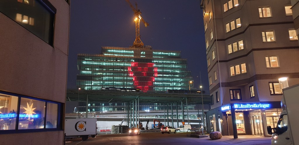 I fönstren i hotellbygget har någon ställt ca 30 vita roll-ups och belyst dom med röda lampor så det blir ett hjärta. Det är så himla fint gjort, tänk att någon kommit på idén, fått lov att köpa in grejer och så räknat efter var dom behöver stå för att det ska bli ett hjärta, och så gjort det.