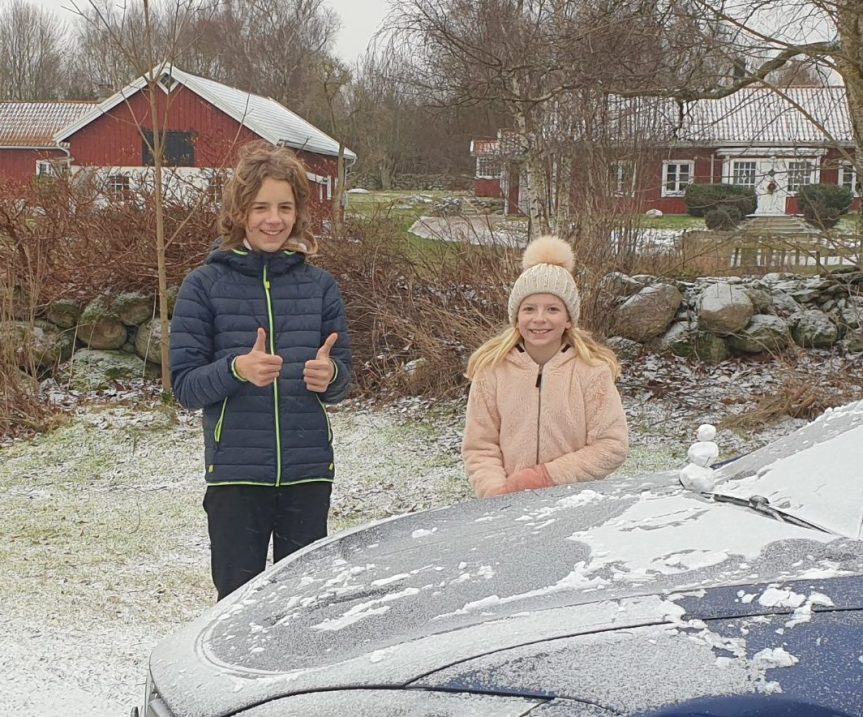 Så….ja, det här var vad det blev av snön idag. Snögubben blev så liten så den fick stå på motorhuven för att synas.