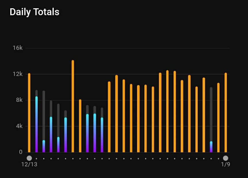 Orange betyder att jag gått så långt jag borde, blålila att jag inte. Ganska stort dropp från fjortondan till femtondan, men så är det…