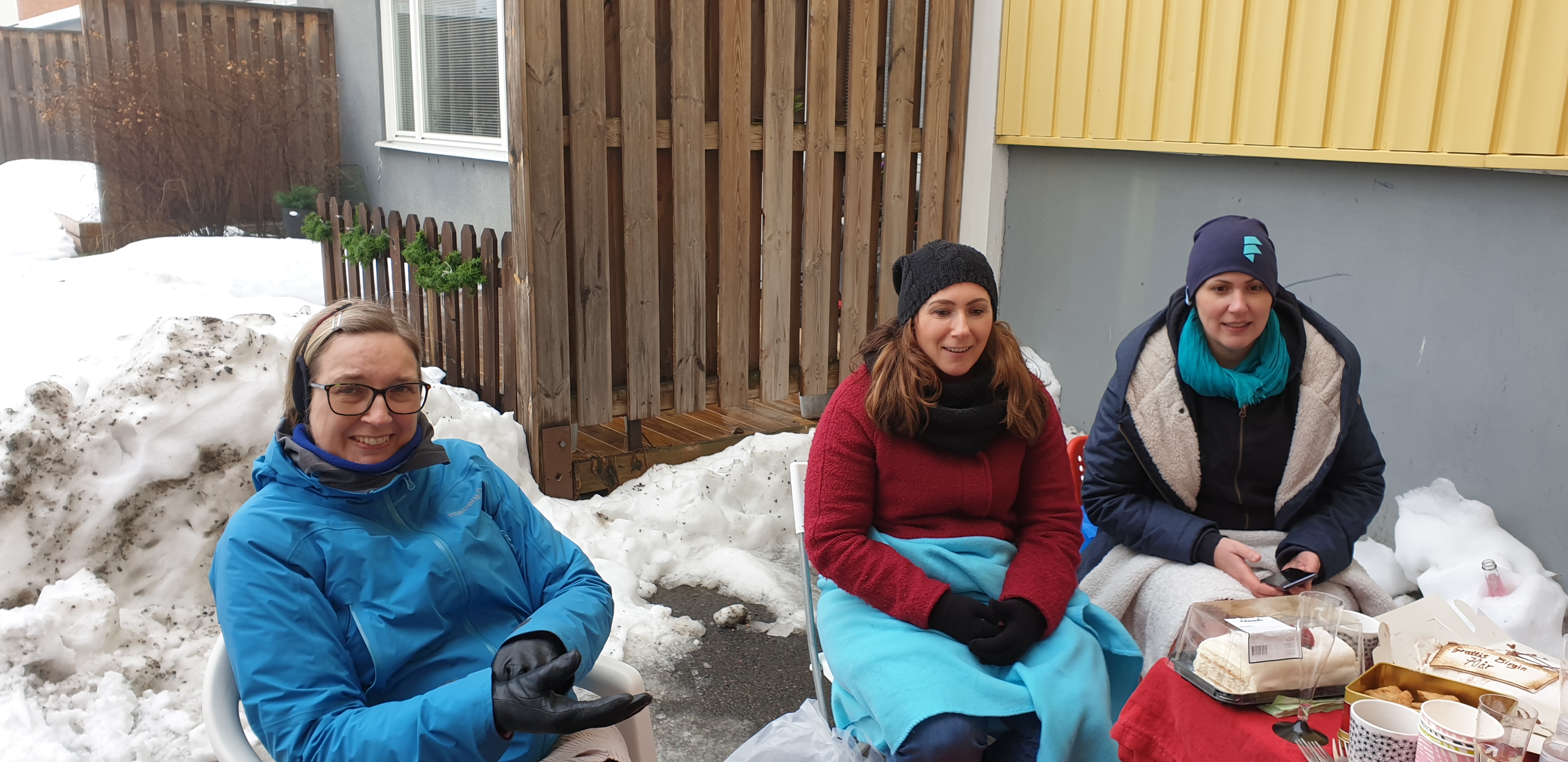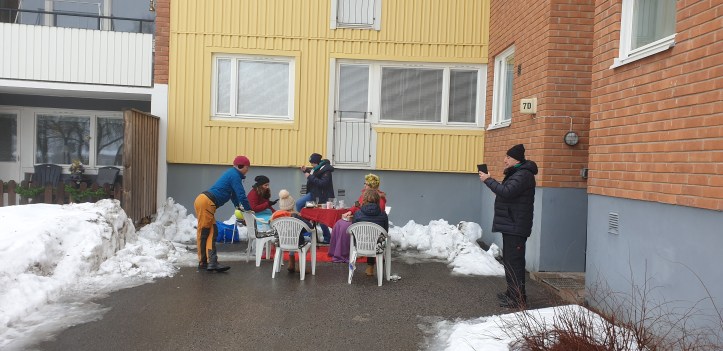 Dom hade packat in tårta, presenter, bord och stolar och var på väg dit för att överraska. Ute på gården, precis som vi tänkt, fast lite trevligare och lite mer genomarbetat får man väl verkligen säga. Men vi bestämde att dom inte säger någonting och så dyker vi bara upp där så småningom.