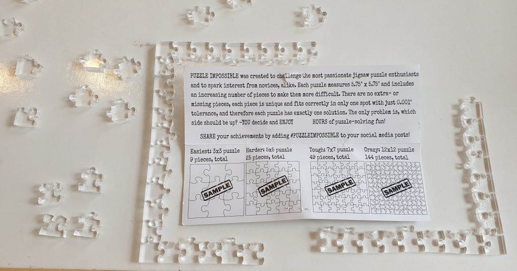 Fighten med det genomskinliga pusslet har börjat. Två långa möten på jobbet där jag inte förväntades bidra särskilt gjorde att jag kunde sitta och lyssna med lite och pussla samtidigt. Eftersom pusslet saknar motiv och dessutom kan vara åt vilket håll som helst, så känns det strategiskt mer viktigt än annars att börja med ramen. Det är givet att det är 12×12, så det är ju något att börja med.
