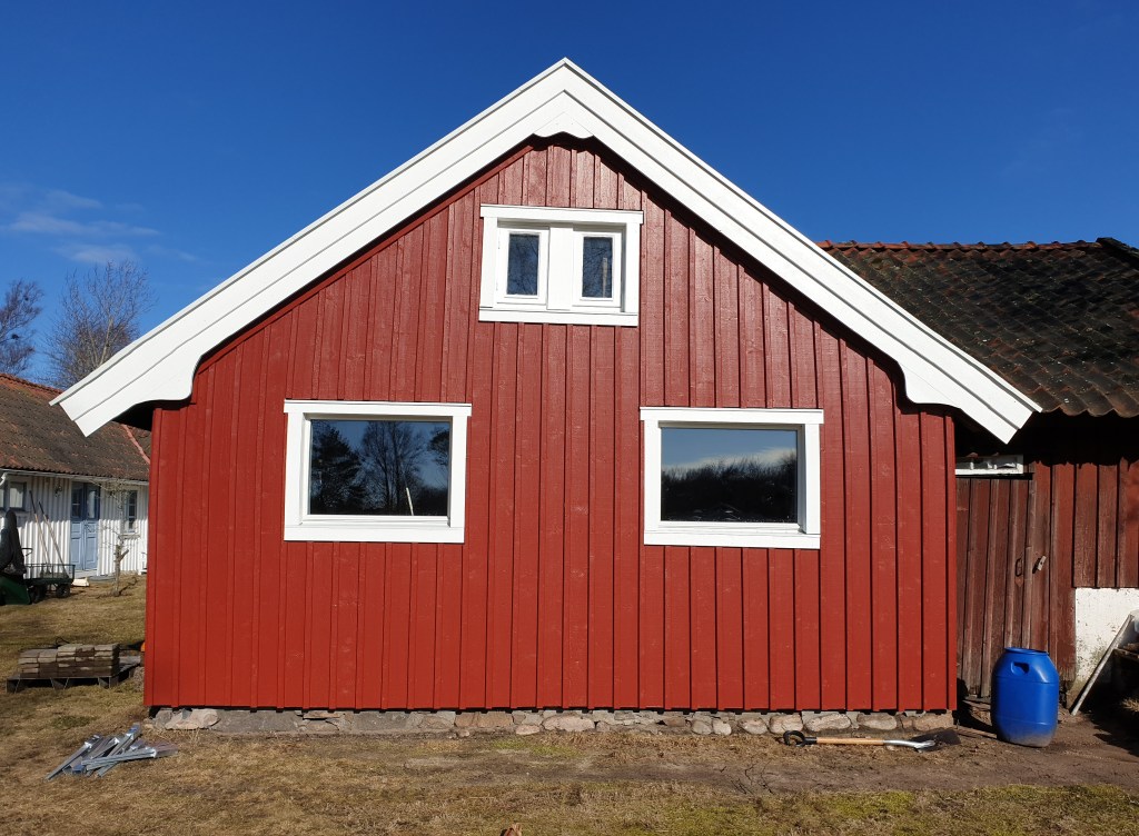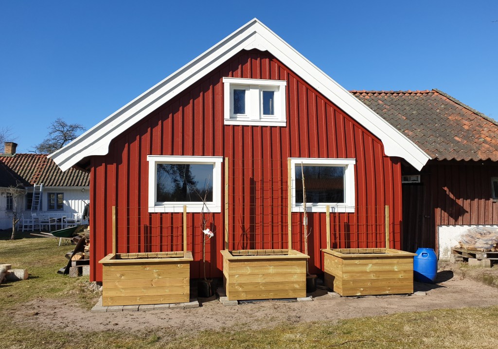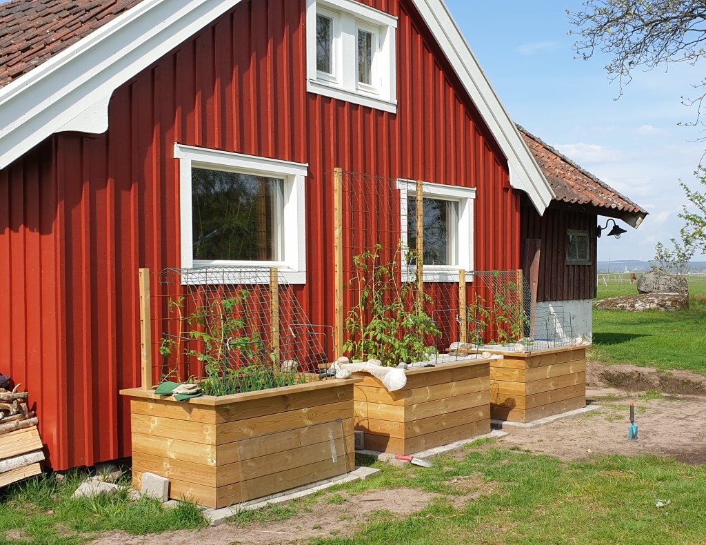 Något som mått bra av hemmavarandet på grund av Corona, förutom alla brädgårdar och hemfixarställen, är vår trädgård. Förra året ville jag att vi skulle sätta odlingslådor på gaveln till lagårn för jag tänkte att tomater borde trivas väldigt bra där – soligt söderläge mot en vägg, och i år blev det förverkligat.