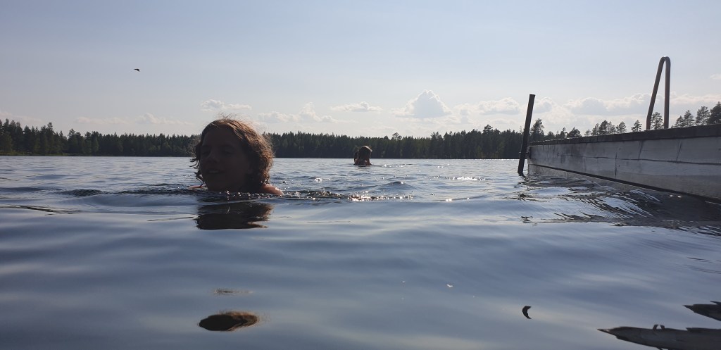 Ja och vad gör man då när det är så varmt så man inte kan göra något egentligen, och det finns en badsjö 75 m bort?