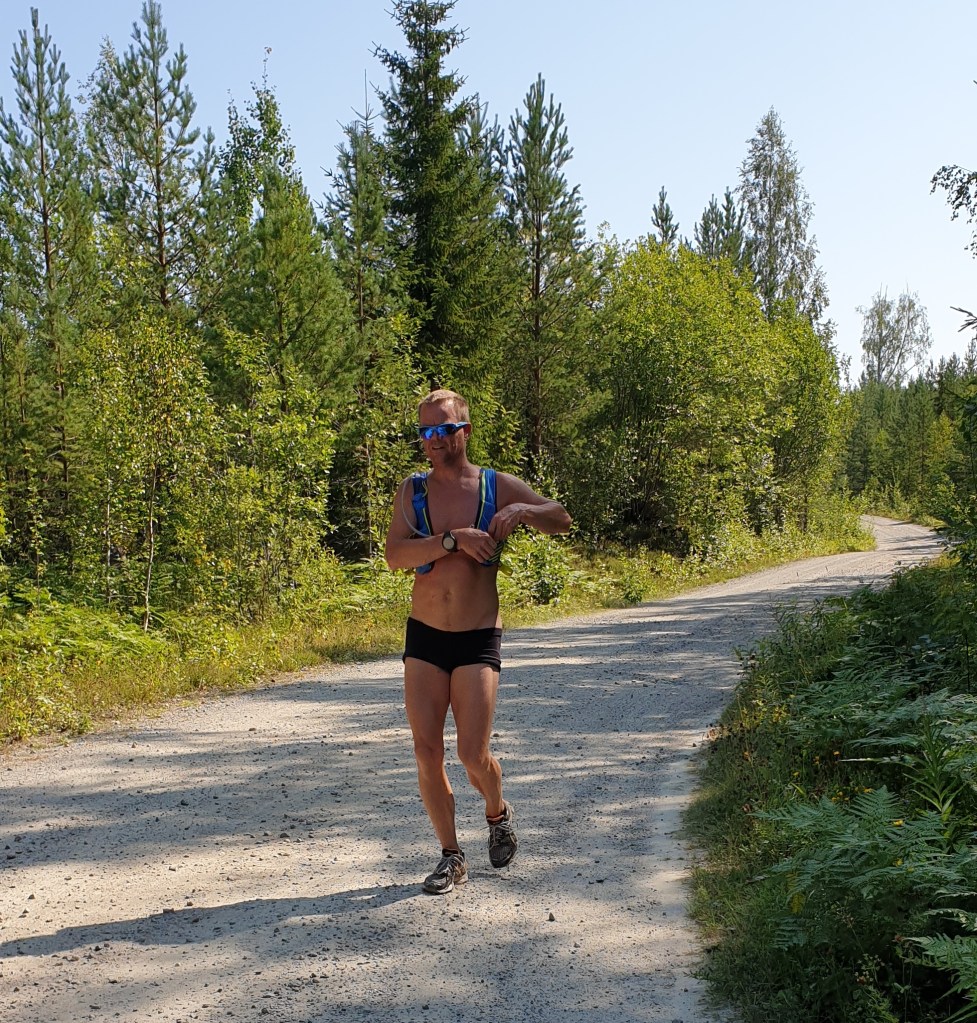 Jag mötte honom som avtalat i en korsning ute i skogen på vägen in mot Långkässlingen och bidrog med lite vatten och tog emot svettiga kläder. Sporthustrun, jajemen!
