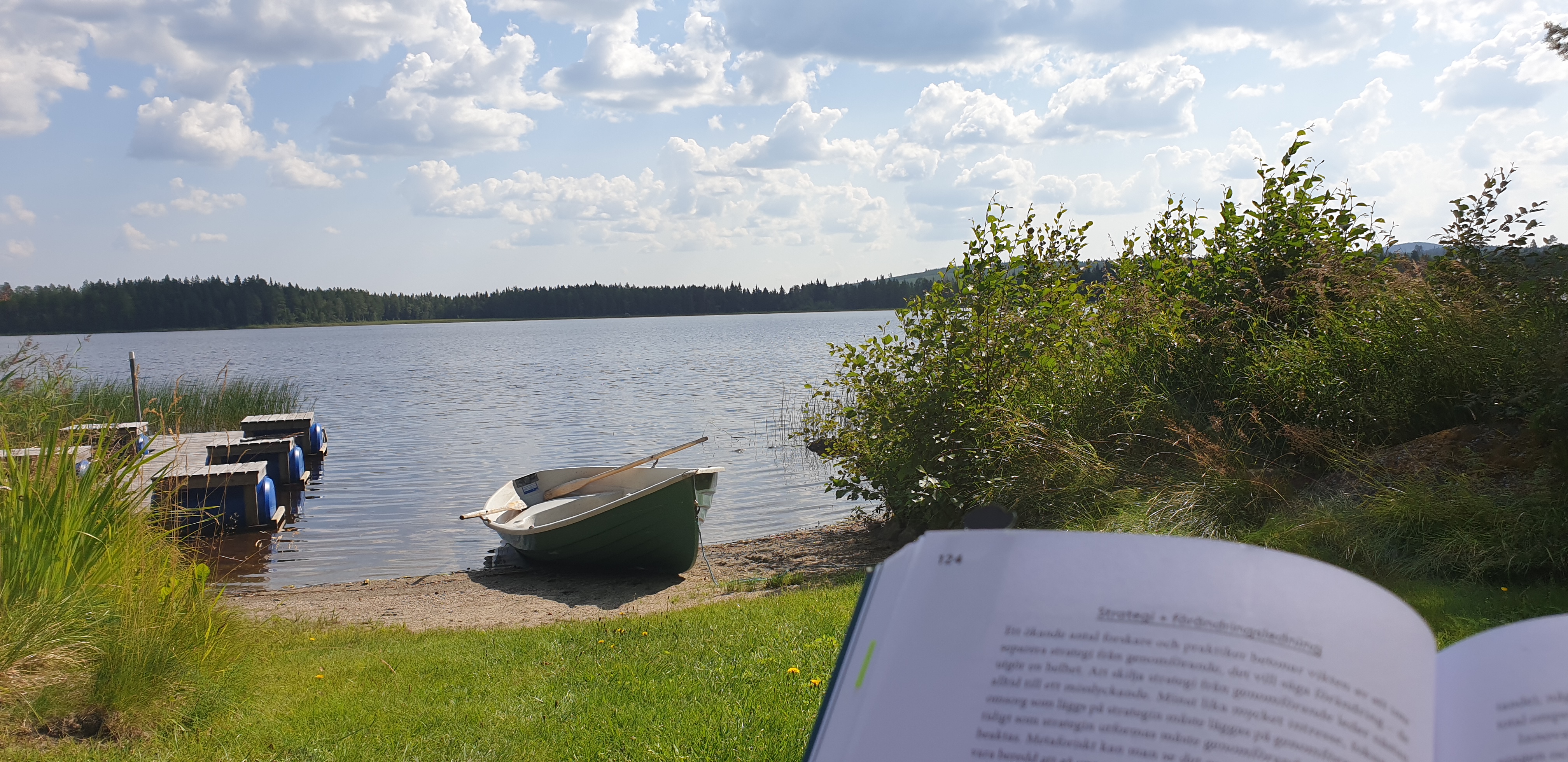 Solstol halvt i skuggan av ett träd, Byssträsket några meter bort ifall andan skulle falla på (men just här faller den inte på så ofta eftersom sjöbotten här är så väldigt slemmig, bättre borta på andra stranden), min semesterbok om förändringsledning och en penna i högsta hugg. Det räcker.
