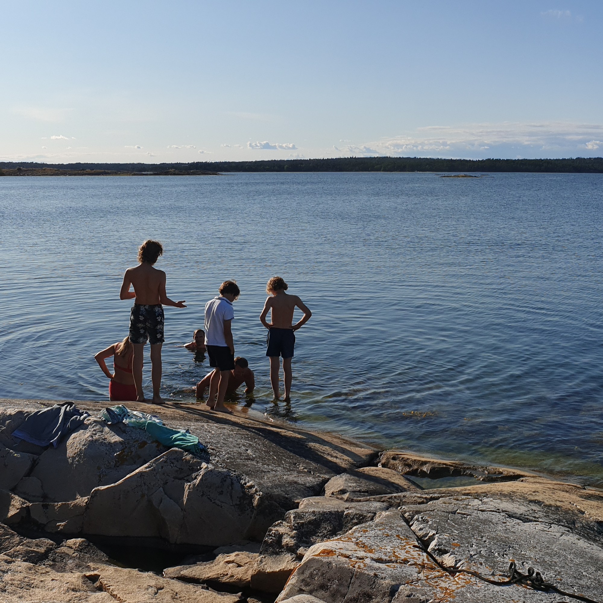 Så….jag kan alltså nu säga att jag varit i Sandhamn! Ingen vettlös fylla, glammiga kläder och fräsiga båtar (tack och lov), men först bad på kobbe, sen middag med familjerna på Dykarbaren på Sandhamn.