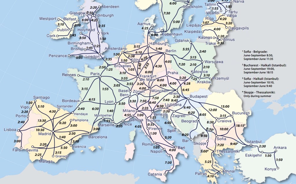 Det här är Europas tågnät just nu, med ungefärliga restider (och för den som börjar jobba upp blodtrycket av att inte Sverige norr om Stockholm är med så är det för att spara plats. Det ÄR med på kartan egentligen)