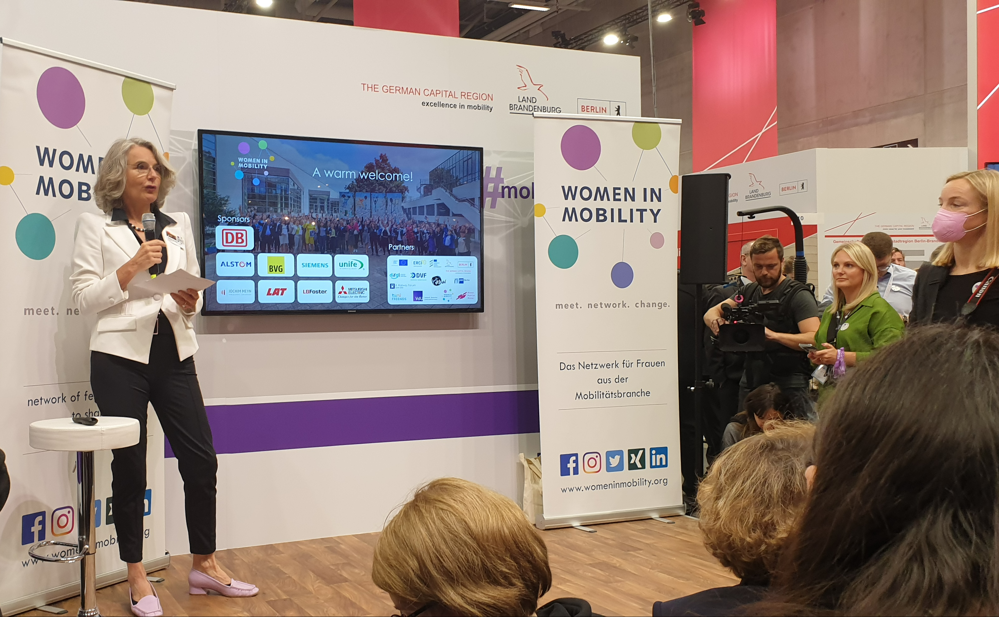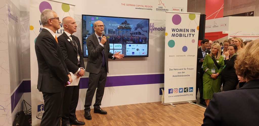 Ja många män i mörka kostymer överallt, det här är helt klart inget kvinnodominerat område. Men det finns det dom som försöker ändra på, tex nätverket Women In Mobility som hade en egen monter på mässan och en samling idag. Många kvinnor var det. Det var meningen att man skulle få bubbel och sen lunch men det var så mycket folk så jag gav upp när det gällde lunchen. Bubbel fick jag inte heller, men det var ok – värre var att jag var så hungrig.